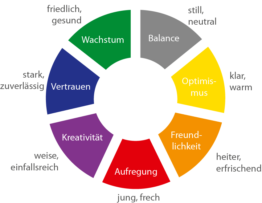 Wenn Sie Farbentscheidungen treffen müssen, empfehlen wir Ihnen, nicht nur nach optischen Präferenzen zu handeln! Treffen Sie Ihre Wahl besser danach, welches Gefühl beim Kunden hervorgerufen werden soll. Einen Anhaltspunkt dafür kann Ihnen unsere Farbskala bieten: