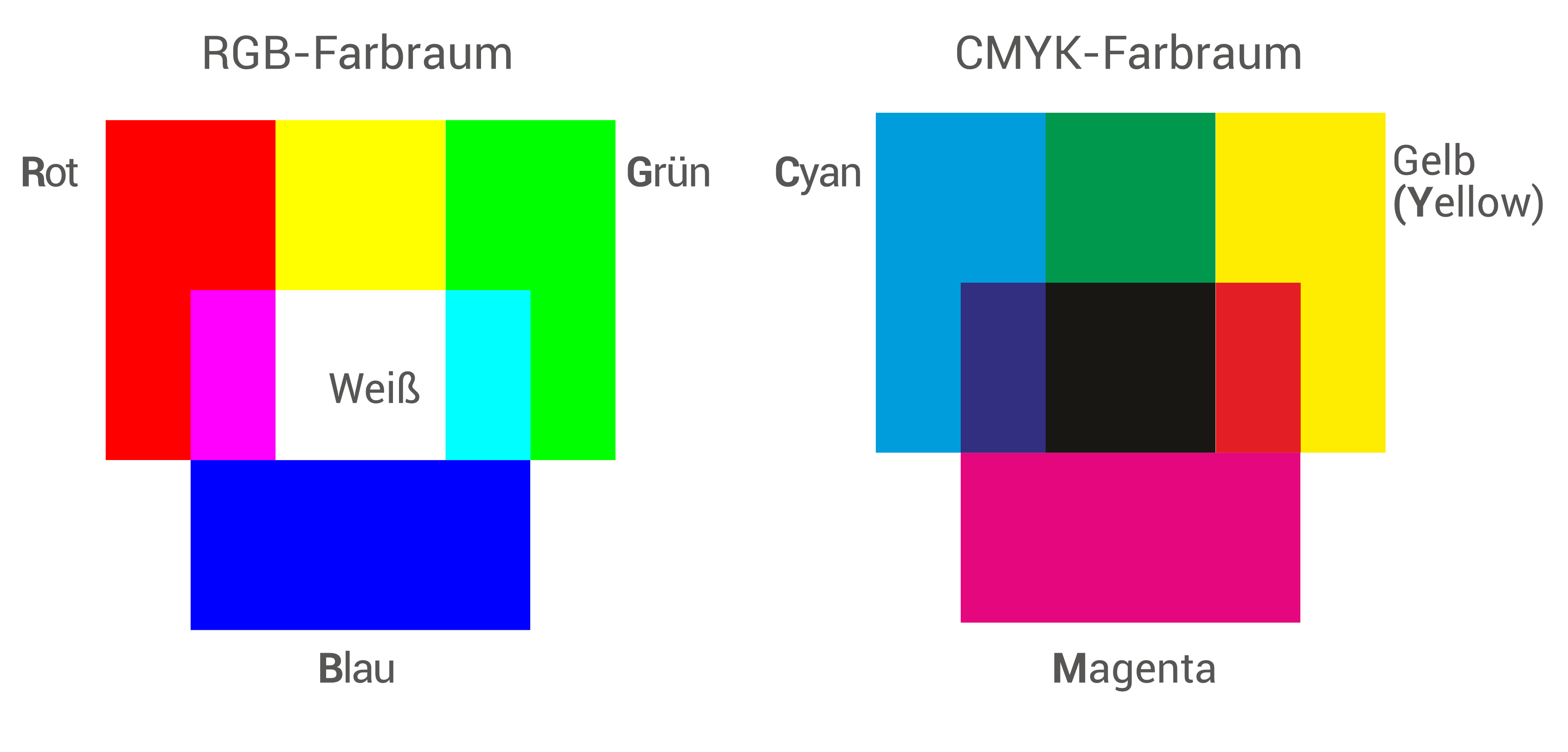 Drucken lässt sich in diesem Farbraum jedoch nicht, denn die Mischung aus roter, grüner und blauer Tinte ergibt kein Schwarz, sondern maximal ein dunkles Braun. Daher werden für Druckerzeugnisse sogenannte Druckfarben im CMYK-Farbraum (Cyan-Magenta-Yellow-Key) genutzt, in dem das Schwarz (die Keyfarbe) extra enthalten ist. Deshalb müssen z. B. Bilder oder Fotos für den Druck vorher vom RGB-Farbraum in den CMYK-Farbraum umgerechnet werden. Es fehlt sonst für die Farbtiefe und den Kontrast das Schwarz.