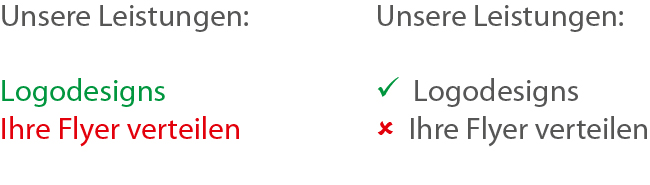 Die Rot-Grün-Schwäche ist eine weit verbreitete Sehstörung in Deutschland. Betroffene können die Farben Rot und Grün kaum voneinander unterscheiden. Je nach Schwere der Sehschwäche werden beide Farbtöne lediglich als Grauschattierungen wahrgenommen. Achten Sie deshalb darauf, Rot und Grün nicht nebeneinander zu verwenden. Die beiden Farben sollten außerdem nicht ausschließlich als Informationsträger dienen. Anstatt beispielsweise eine Aufzählung nur farblich zu kategorisieren, ergänzen Sie besser passende Symbole.